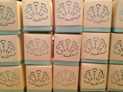 I wanted to keep an ocean-life theme and first found these shell boxes ($5.25 per dozen Oriental Trading) that I totally fell in love with, so whatever favor I ended up going with had to fit in these boxes. Normally, I wouldn’t select the gift packaging first but I already knew that the favors were going to be small remembrances so the boxes would be fine. Almost immediately after, I saw these scented votive tins ($25 per dozen Oriental Trading) that I had personalized. Favors were done!