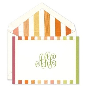 For a more traditional monogrammed card with just a bit of an update, check out these Caspari selections (top) with pops of color and unexpected textures or Stevie Streck’s cards (bottom) with illustrations and shape designs.