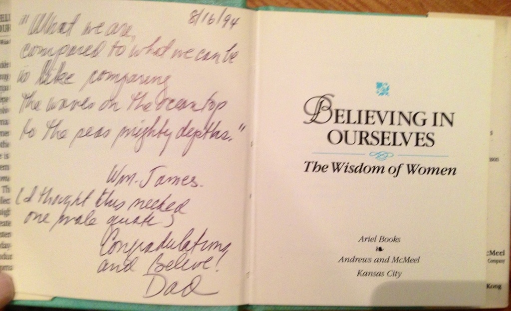 So this weekend, when I was walking down memory lane, I though I was looking through a box of baby memorabilia. And then I came across a little book of quotes called “Believing in Ourselves: The Wisdom of Women.” Looking at it, I assumed it was a gift from a friend from my shower when I had my son or daughter, but then I decided to open it up… and I saw this inside.