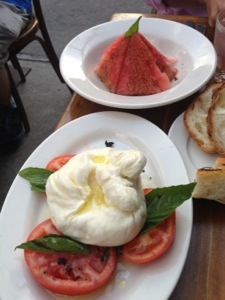 By 6:30 we were out of the movie and ready to go down to Rivington in the East Village for our 7:45 dinner reservation at Sauce. We were not anticipating how amazing this meal would be, especially after the dinner we had the previous night. I was given a Sauce gift certificate last Christmas by my staff and I have not had a chance to use it yet. Playing “tourist” for a weekend seemed like just the perfect opportunity…and it was. Let me tell you, this is another MUST GO place. The food is incredible, the atmosphere is very charming, the staff is warm and friendly and did I mention the food??? I had been told in advance about the polenta bolognese, and we honed in on on two appetizers: watermelon salad and a burrata–done and done!
