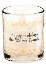 I wanted to keep with a celestial theme so I had these votives personalized (Oriental Trading, $12.50/dozen pictured above) with the event name and date scattered around tables and had a few extra made as keepsakes for guests to take home.